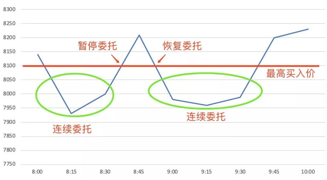 如上图所示,当最新成交价低于小王设置的”最高买入价” 8100 USDT 时,系统就会进行连续委托,当最新成交价高于小王设置的”最高买入价” 8100 USDT 时,系统就会停止委托。