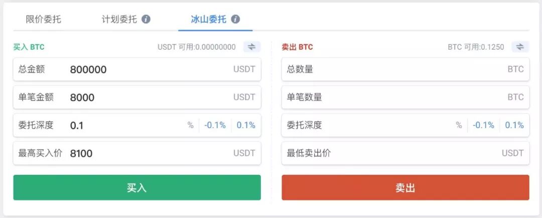 小王要买入 80 万 USDT 的 BTC,为了不过于影响盘面价格,于是使用冰山委托订单类型进行小额分批交易;每批次委托买入 8000 USDT(实际下单会在 90% ~ 110% 浮动)的 BTC;而委托买入价为:最新买1价 * (1 - 0.1%);而且还设置了最高买入价:8100 USDT,表示买入价不会高于 8100 USDT。