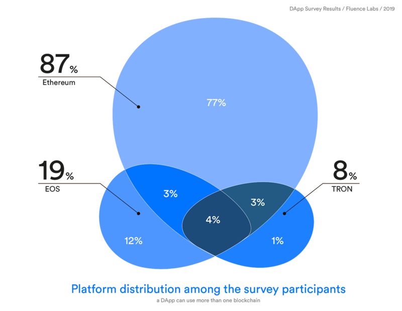 大多数 DApp 采用以太坊平台(87%),排名第二的是 EOS(19%),第三名是 TRON(8%)。还有 10% 的受调查项目同时构建在多区块链之上。虽然我们对采用了其他区块链的 DApp 非常好奇,但并不能准确的统计出这些项目的数量。